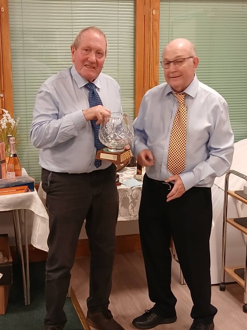 Our Club President John Watson receiving the Hervey Cup, which was donated by our landlords and is annually played for against Sweffling Bowls Club.